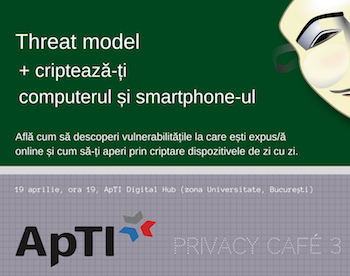 În 19 aprilie, la ora 19:00, te invităm o întâlnire informală cu Asociația pentru Tehnologie și Internet. La Privacy Café 3, vei afla cum descoperi ce vulnerabilități ai online și cum să-ți criptezi dispozitivele de zi cu zi: compterul și smartphone-ul (deci nu uita să iei telefonul la tine, cel puțin!).