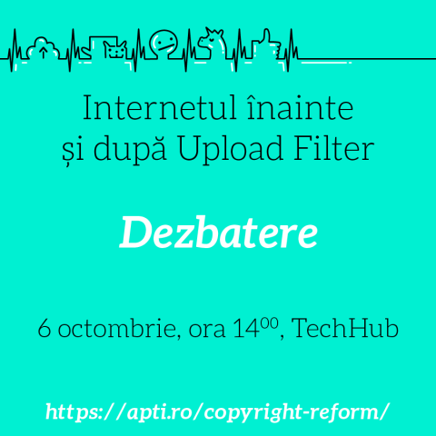 Vineri, 6 octombrie, între 14:00-16:00, ne întâlnim la TechHub București, să discutăm în cadrul unei mese rotunde despre efectele Upload Filter. I-am invitat pe Cristian China Birta (Kooperativa 2.0), pe Andrei Radu (CEO Gala Premiilor E-Commerce & Co-Founder TRUSTED.ro), Cătălin Teniță (Founder Tree.ro - Zelist), Cristu Gabriel Chirfot (Reprezentanța Permanenă a României la Uniunea Europeană), Cătălin Drulă (președintele Comisiei de IT&C, Parlamentul României) și alți antreprenori și profesioniști din zona tehnică, experți în politică europeană și cetățeni implicați în zona digitală, pentru a dezbate Articolul 13 din propunerea de directivă pentru reforma copyright în UE.