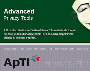 Pe marti 19 septembrie, la ora 18:30 ne intalnim la un nou Privacy Cafe - întâlnire informală cu Asociația pentru Tehnologie și Internet - la ApTI Digital Hub. De data aceasta cu un program mai pentru privacy tech geeks, in care fiecare isi prezinta ultimul tool favorit in materie de privacy.