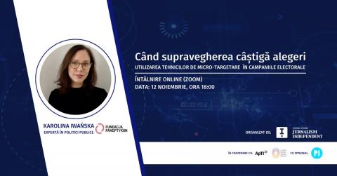 ApTI susține evenimentul realizat de Centrul pentru Jurnalism Independent, cu sprijinul Privacy International, care va fi cuprinde o discuție pe tema micro-targetării politice în campaniile electorale, alături de Karolina Iwańska, expertă în politici publice la Panoptykon Foundation (Polonia).
